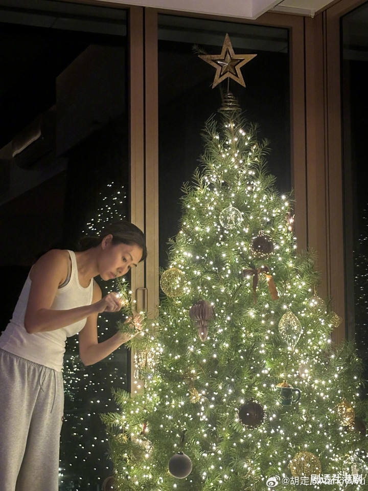近日,胡定欣忙着为即将到来的圣诞节做准备,她在家中专门安置了一棵差不多两米高的圣诞树,作为女主人,胡定欣亲手把圣诞树上的小物件挂上去,十分用心。