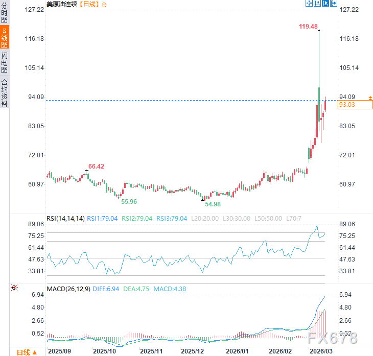 (美原油连续日线图,来源:易汇通)北京时间9:53,美原油连续现报93.41美元/桶。