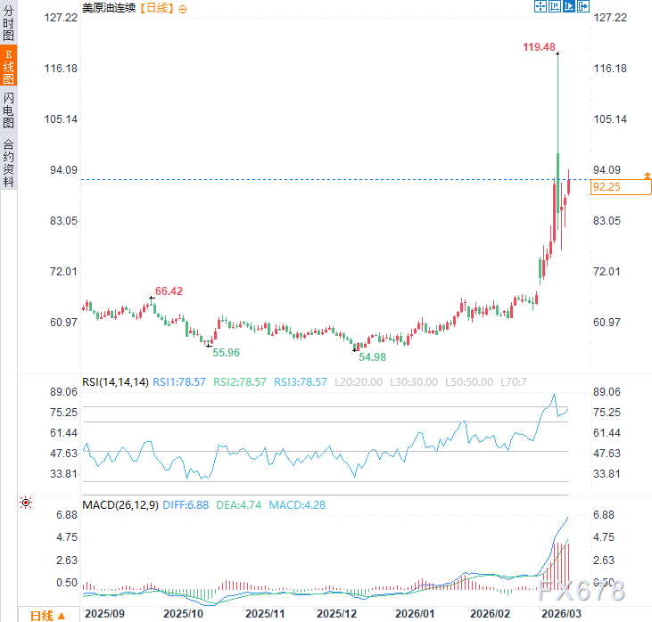 北京时间9:40,美原油连续现报92.78美元/桶。